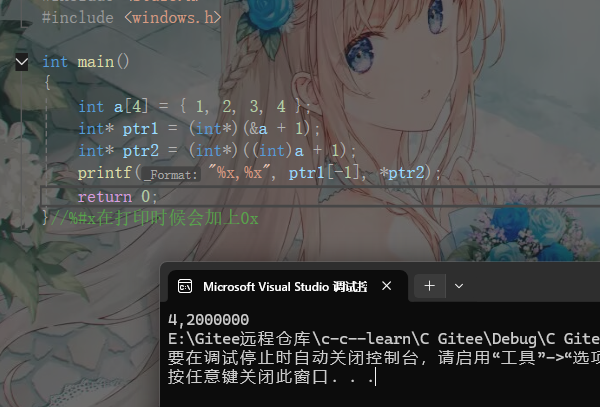 这个代码的输出ptr1很简单就能推出,跨过整个数组然后转成int*类型,然后再是输出ptr1[-1]就是往前一个整型内存然后输出就好了,也就是4,这个在指针那就讲过了,就不多讲了