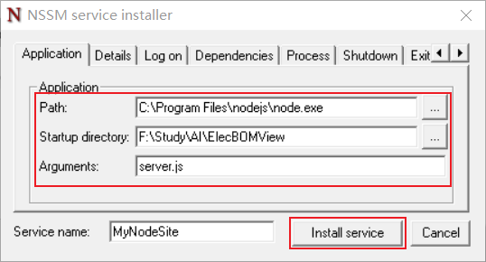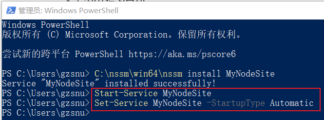 注意:其中MyNodeSite是给 Windows 服务起的名字,相当于"标签",不是系统关键字,也不是文件夹名,随便改,只要前后一致即可。