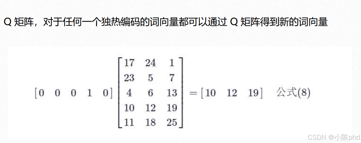 它的核心是**"降维+语义关联"**:通过一个训练好的Q矩阵,把高维独热向量压缩成低维稠密向量(比如图中5维转3维)。