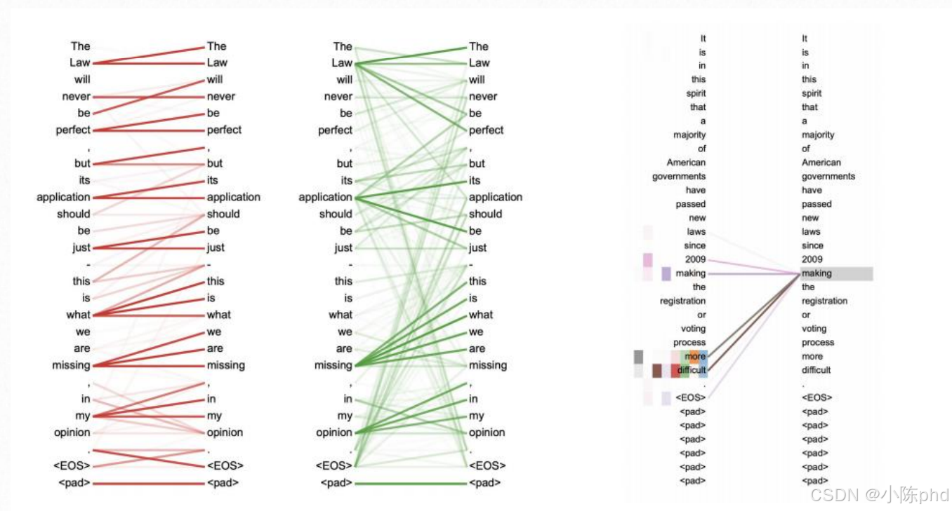 - 多角度语义捕捉:"多头"意味着机器可以同时从多个维度关注句子(比如图中不同颜色的线代表不同"头")------有的头关注语法(如"it"和"is"的关联),有的头关注语义(如"making"和"difficult"的关联);