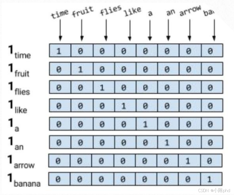 它的逻辑很直接:给每个单词分配一个向量,只有单词对应的位置是1,其余全为0 。比如"time"对应[1,0,0,...],"fruit"对应[0,1,0,...]。