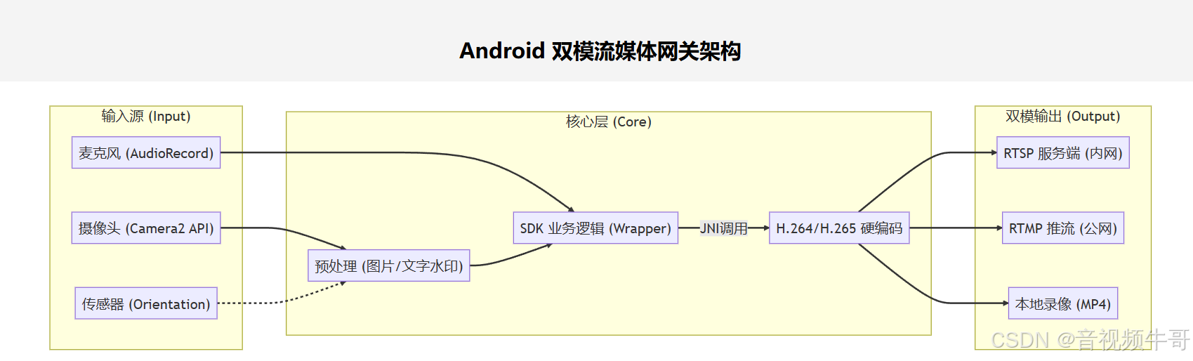 构建这套系统的最大挑战,在于如何在有限的移动端算力下,同时满足"内网低延迟"与"外网高可靠"的异构需求。如果简单粗暴地开启两个推流实例,CPU 和内存消耗将成倍增加,导致设备发热甚至丢帧。