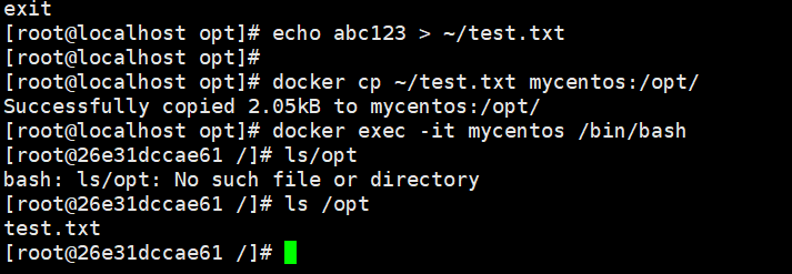 docker cp mycentos:/opt/test.txt ~/abc123.txt