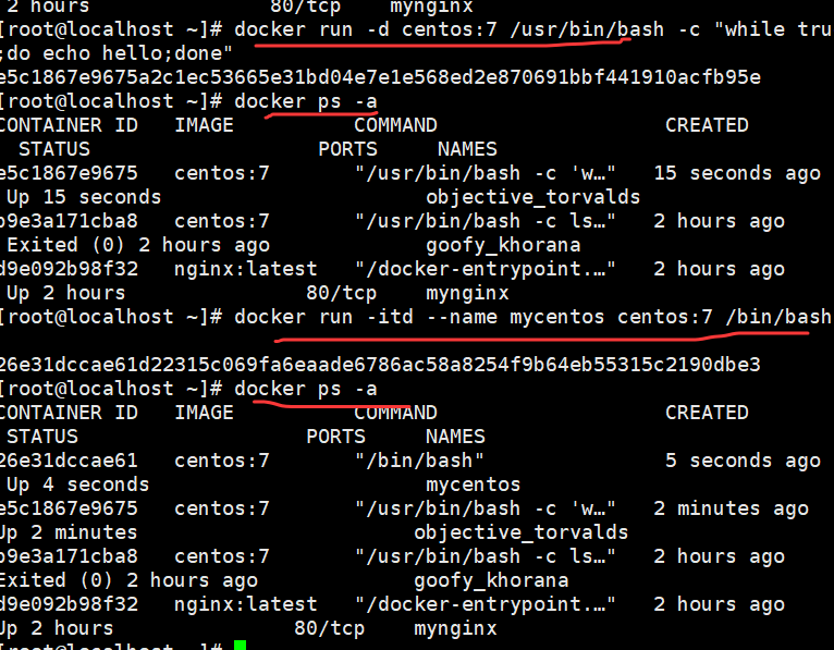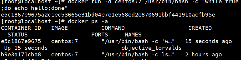 docker run -d centos:7 /usr/bin/bash -c "while true;do echo hello;done"