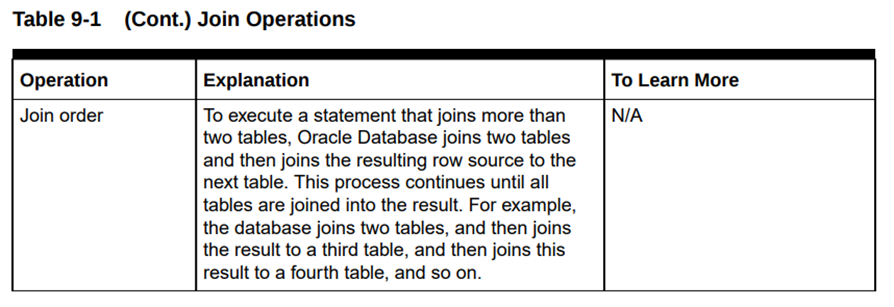 • For join statements with outer join conditions, the table with the outer join operator typically comes after the other table in the condition in the join order.