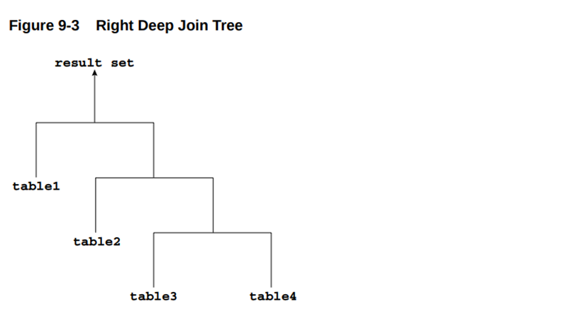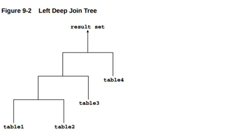 The input of a join can be the result set from a previous join. If the right child of every internal node of a join tree is a table, then the tree is a left deep join tree, as shown in the following example. Most join trees are left deep joins.