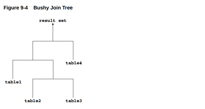 If the left or the right child of an internal node of a join tree can be a join node, then the tree is called a bushy join tree. In the following example, table4 is a right child of a join node, table1 is the left child of a join node, and table2 is the left child of a join node.