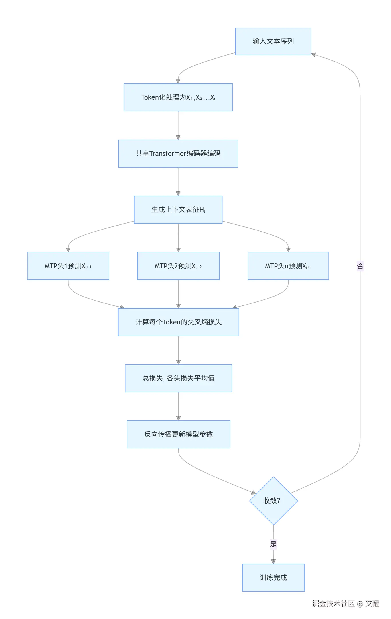 Hₜ,并行预测t+1到t+n个Token; - 计算每个MTP头的预测损失(交叉熵),总损失为所有头损失的平均值;