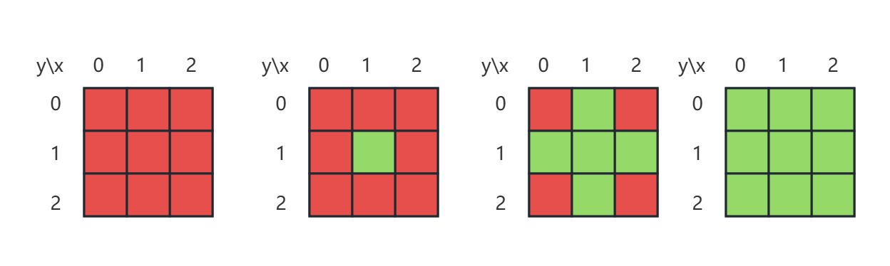 如上图,是一个3px,3px 像素的图片。如果鼠标点击到(1,1)坐标的像素,扩散算法就是向上下左右去扩散,被扩散的位置继续向上下左右去扩散,直到超出边界,或者颜色不相近,或者颜色和目标颜色完全相同为止。