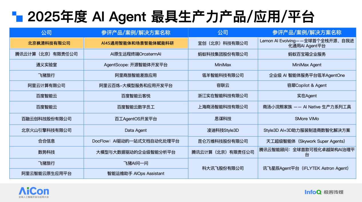 12月19日,InfoQ 极客传媒携手模力工场评选的"2025中国技术力量榜单"(下称"技术榜单")正式揭晓。枫清科技(Fabarta)"AI4S通用智能体和场景智能体" 凭借自主研发的AI智能体技术与科研场景的商业化落地能力,成功入选该榜单"AI Agent最具生产力产品"。