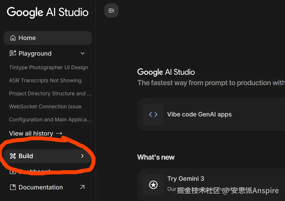 访问aistudio.google.com/并注册一个免费账户,然后点击侧边栏中的"构建"开始使用。