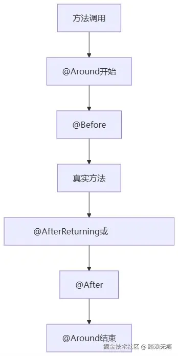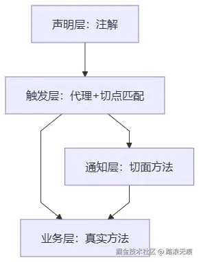 @Before、@Around等注解,只是配置,不执行任何逻辑 - 触发层:代理对象在方法调用时,通过表达式匹配决定哪些切面要执行