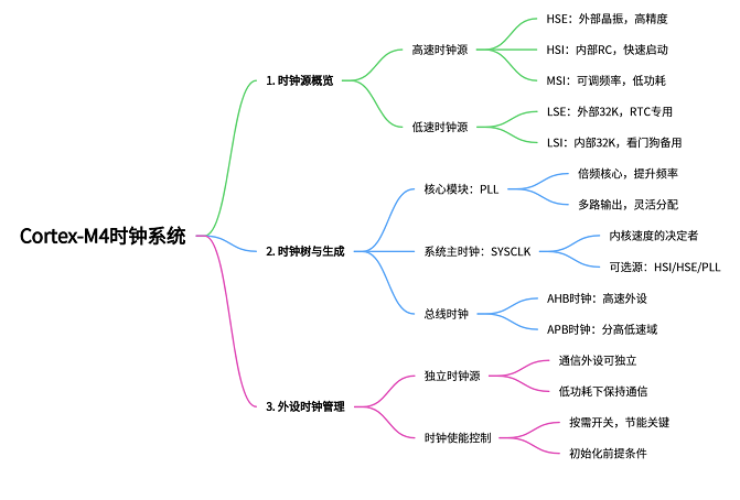 Cortex-M4微控制器通常提供多个时钟源,以满足不同场景下对精度、速度和功耗的需求。主要可分为高速和低速两大类。