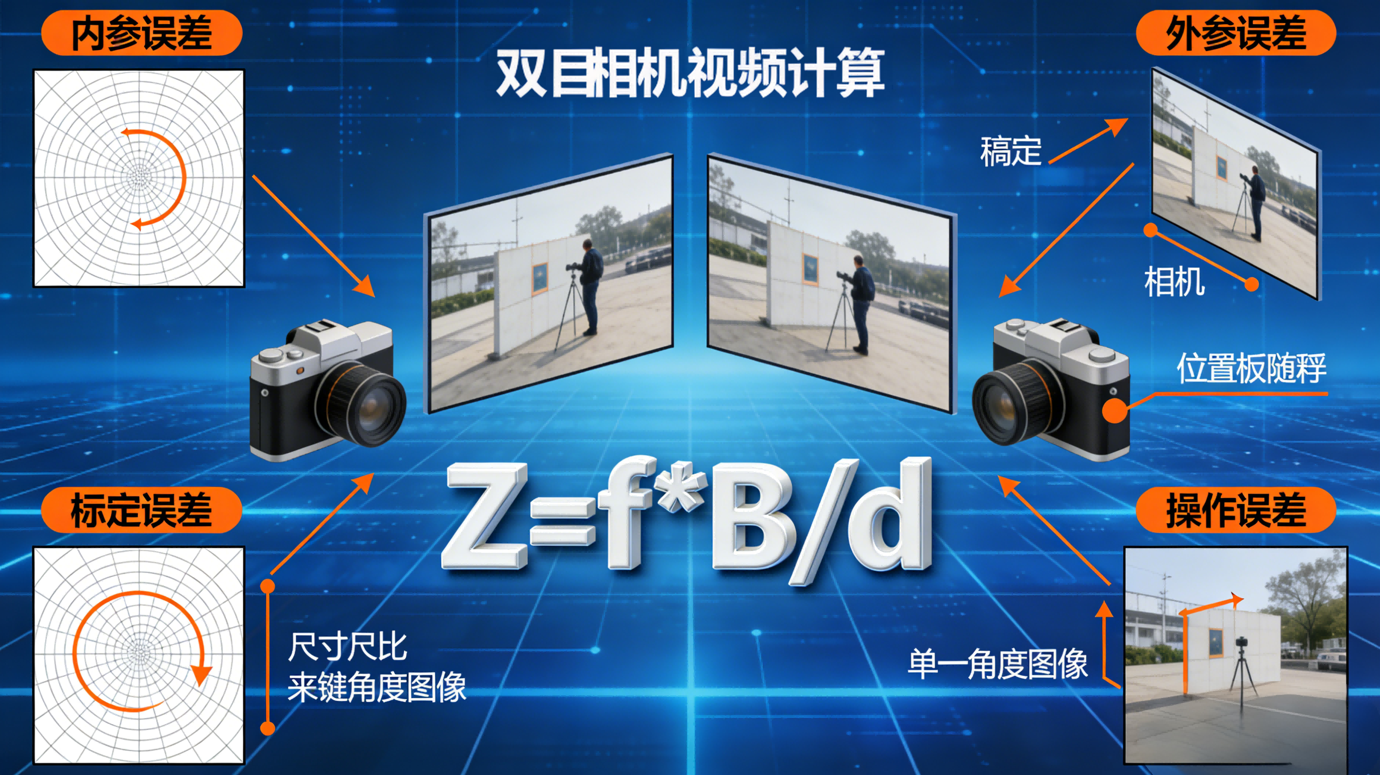 双目视觉的视差,是左右相机拍摄同一物体的像素位置差,视差与物体深度成反比。视差误差的来源主要分4类,也是工业标定的核心痛点: