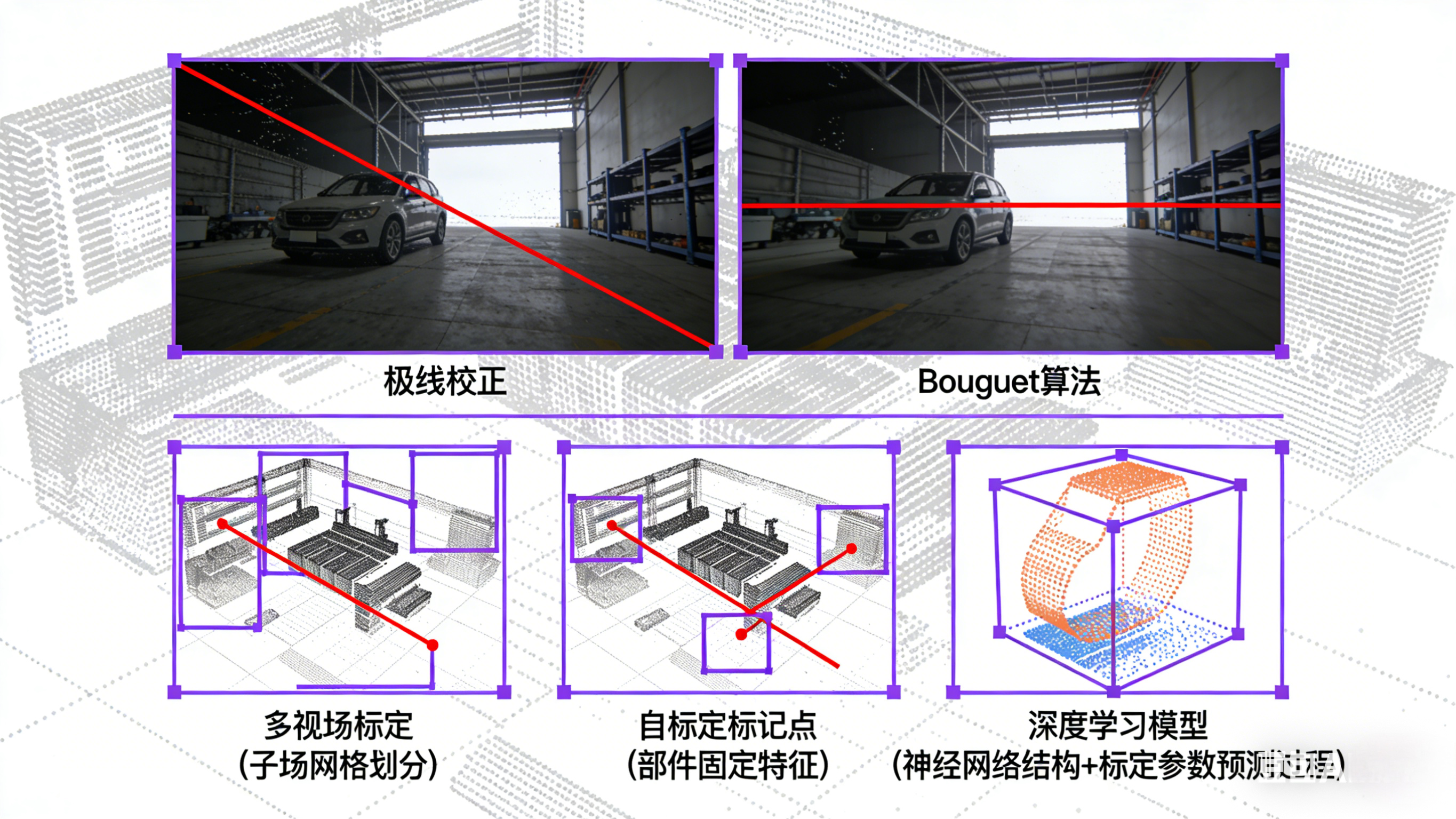 核心逻辑:产线的振动、温度变化会导致相机位姿偏移,通过自标定算法实时校准参数,消除环境带来的视差误差;
