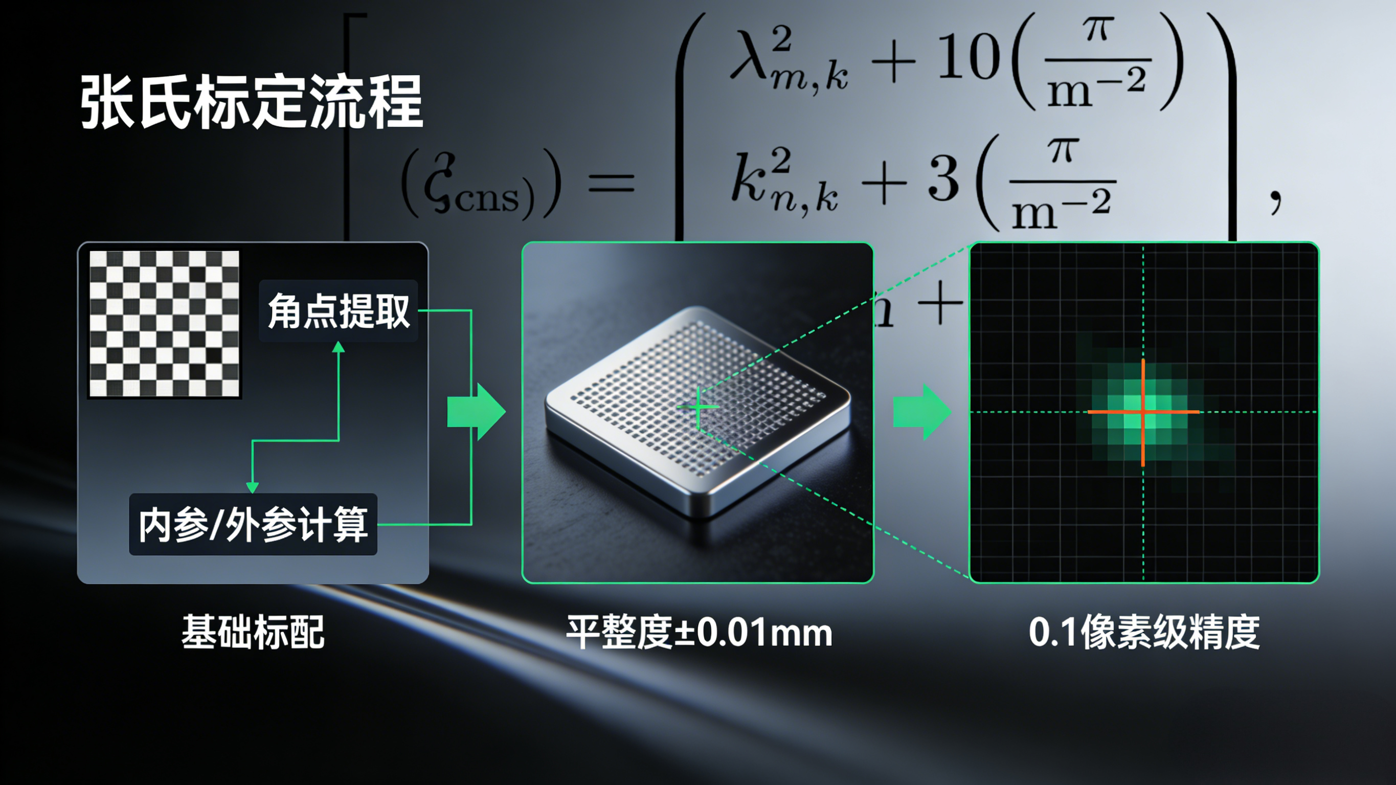 核心逻辑:在提取棋盘格角点时,采用亚像素级细化算法(如高斯牛顿法),将角点定位精度从"像素级"提升到"亚像素级"(0.1像素以内);