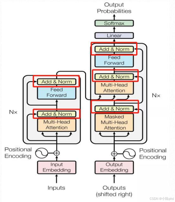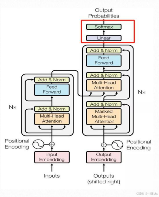 d_model维特征映射到"词汇表大小"的维度; - Softmax函数:将映射后的结果转换为"0~1"的概率分布(每个位置对应一个单词的概率)。