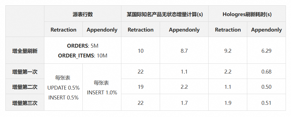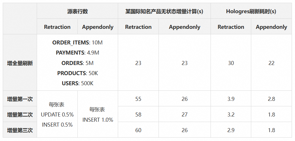 相比之下,Hologres 采用了有状态增量计算模型 :在首次全量构建 Dynamic Table 时,同步生成并持久化关键的中间状态(例如聚合结果、多表 Join 的中间产物等)。后续的增量刷新只需将新增或变更的数据与这些状态表进行高效合并,无需重复处理历史数据。这种设计以有限且可控的额外存储开销为代价,显著提升了复杂场景下的刷新性能和资源利用率,尤其适合"海量历史 + 少量增量"的典型业务负载。