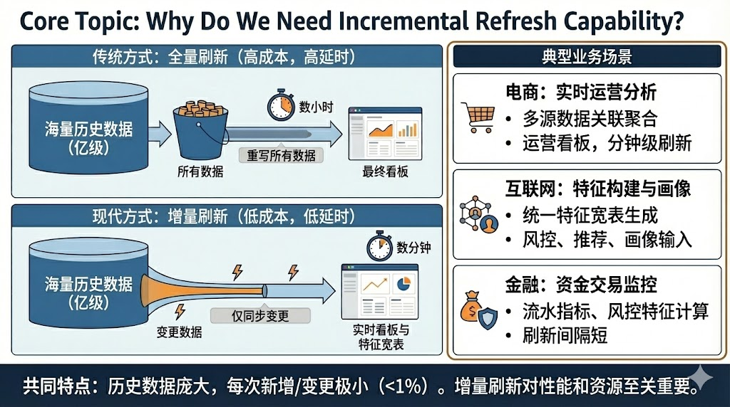 因此,在"历史数据量大、实时数据实时产生"的场景下,引入真正高效的增量刷新机制,是提升数据时效与降低资源利用率的关键。