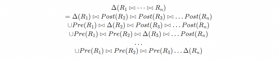 无状态多表Inner Join的增量计算公式如下(原理可参考论文),根据实际执行计划推测某无状态增量计算引擎的多表Join增量计算应该也是基于该公式实现的