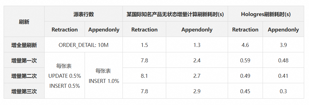 对于Append only的源表,很多增量计算算子都可以大幅简化,状态表也可以大幅缩小。所以在性能环节,可以看到Append only源表的增量计算性能会更好。