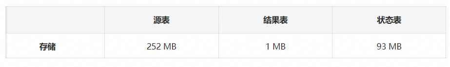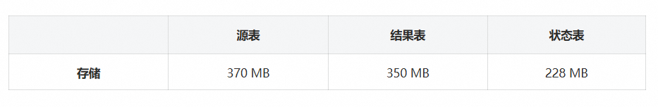 Hologres增量刷新快的核心原因是每次增量计算都是基于上次计算生成的状态表(State),这极大的简化了增量计算逻辑。此例中Hologres中各表存储大小如下所示(源表是Retraction的情况),结果表很小,而因为min/max/count distinct这两种聚合函数与sum/count这类不同,状态表需要存储对应列的所有原始数据,所以相比结果表要大很多。