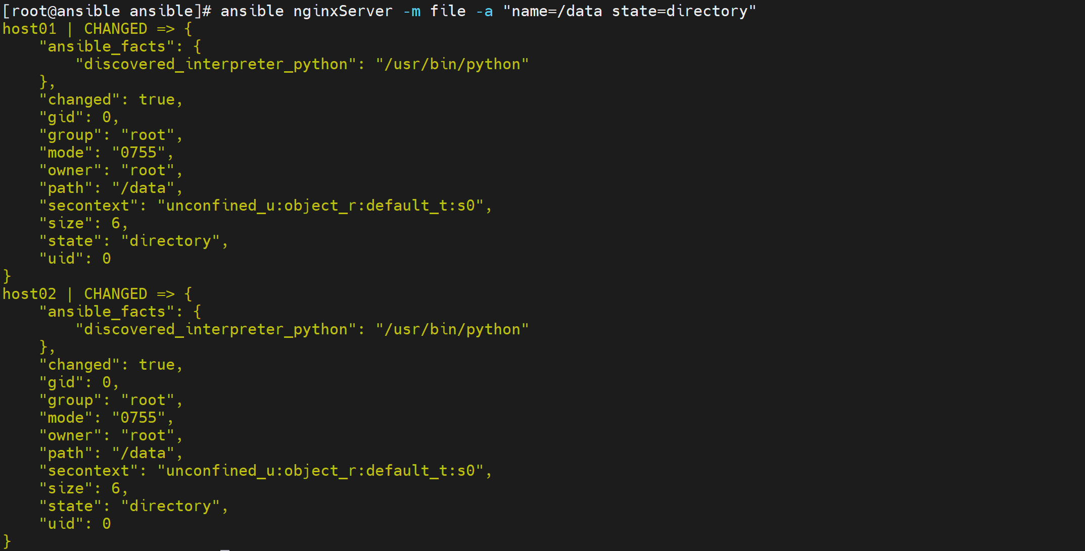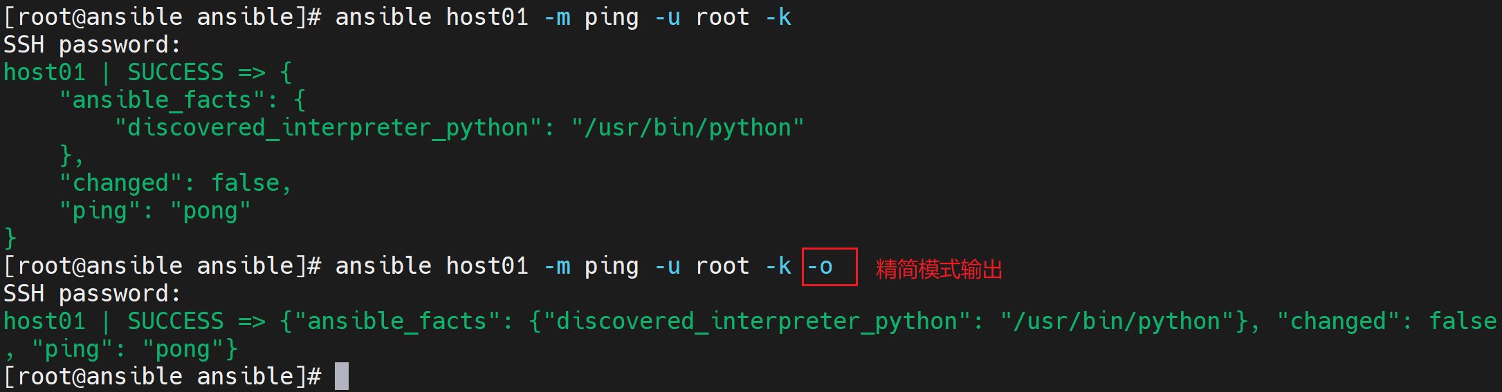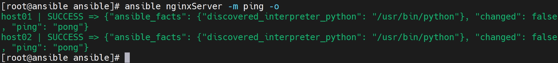 使用单个模块,支持批量执行单条命令。ad-hoc 命令是一种可以快速输入的命令,而且不需要保存起来的命令。就相当于bash中的一句话shell