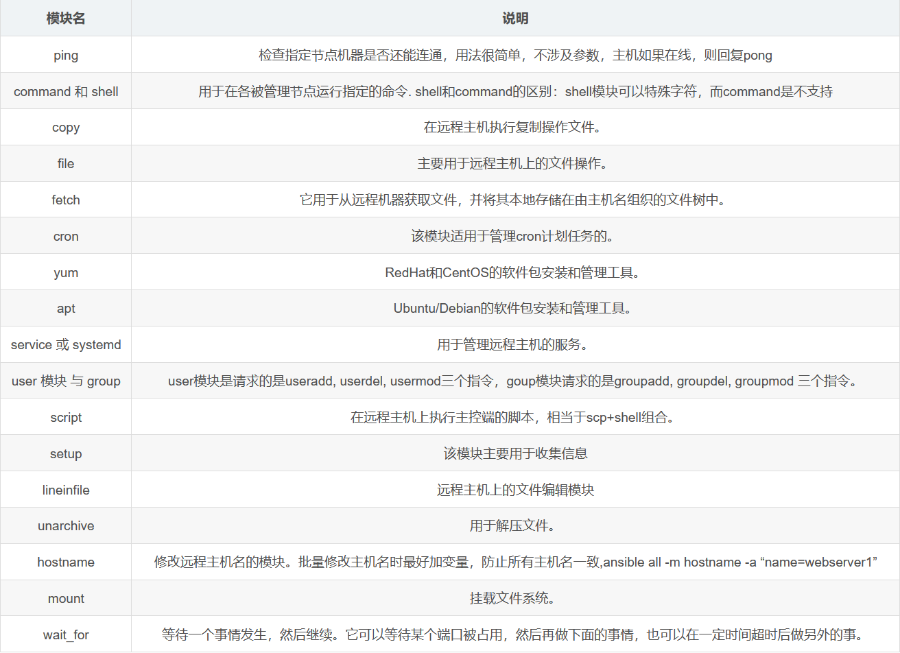 常用的模块有:copy文件拷贝 yum软件安装与卸载 file文件管理 shell执行shell命令 user用户管理 service服务管理等