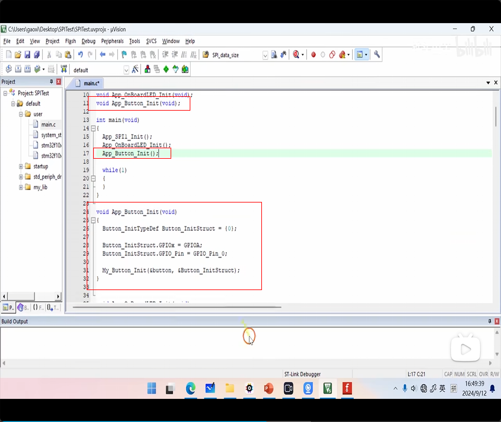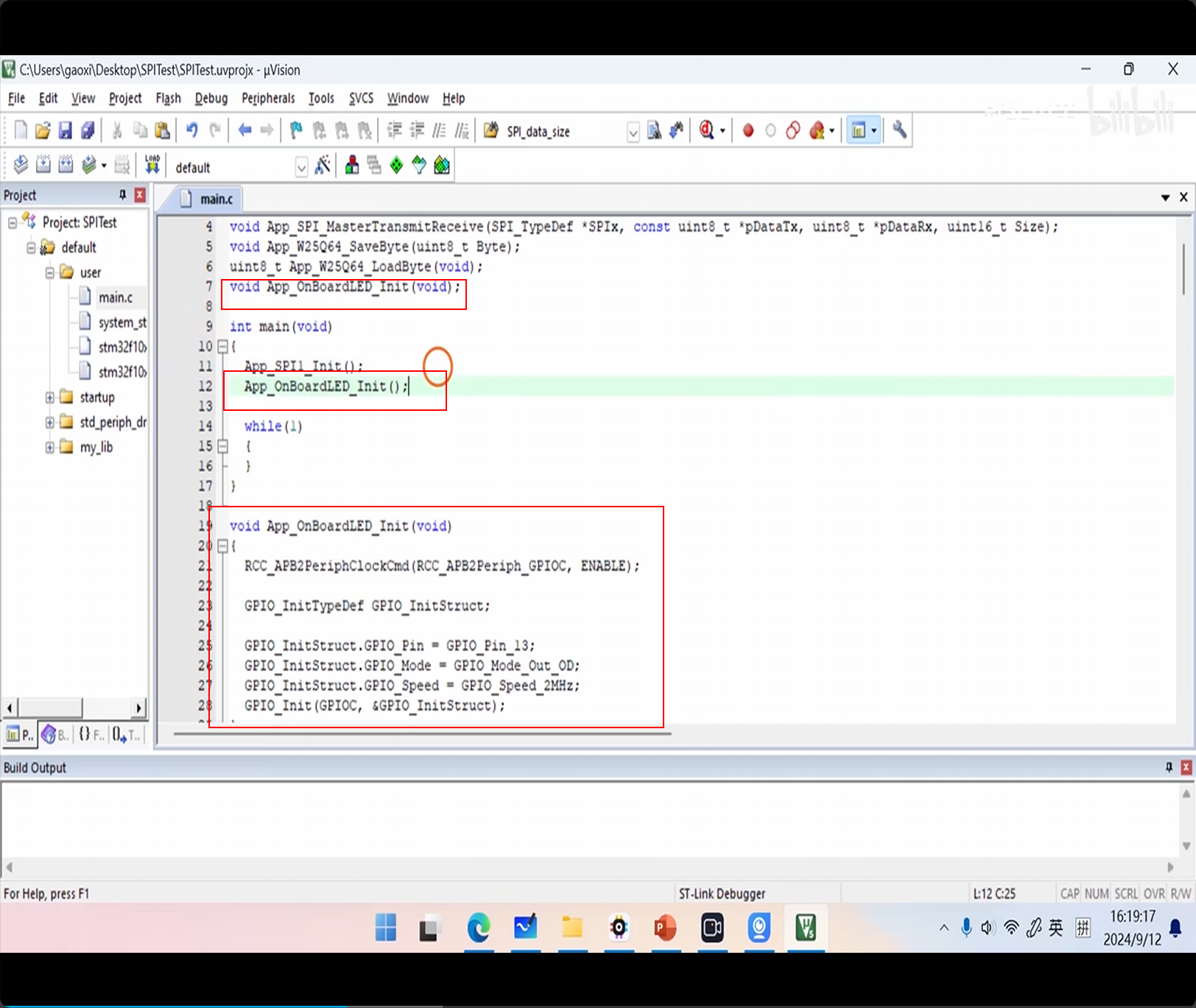 上图为初始化板载 LED 具体代码。定义函数声明和函数、开时钟、配引脚和配置、init,放进 main 结束
