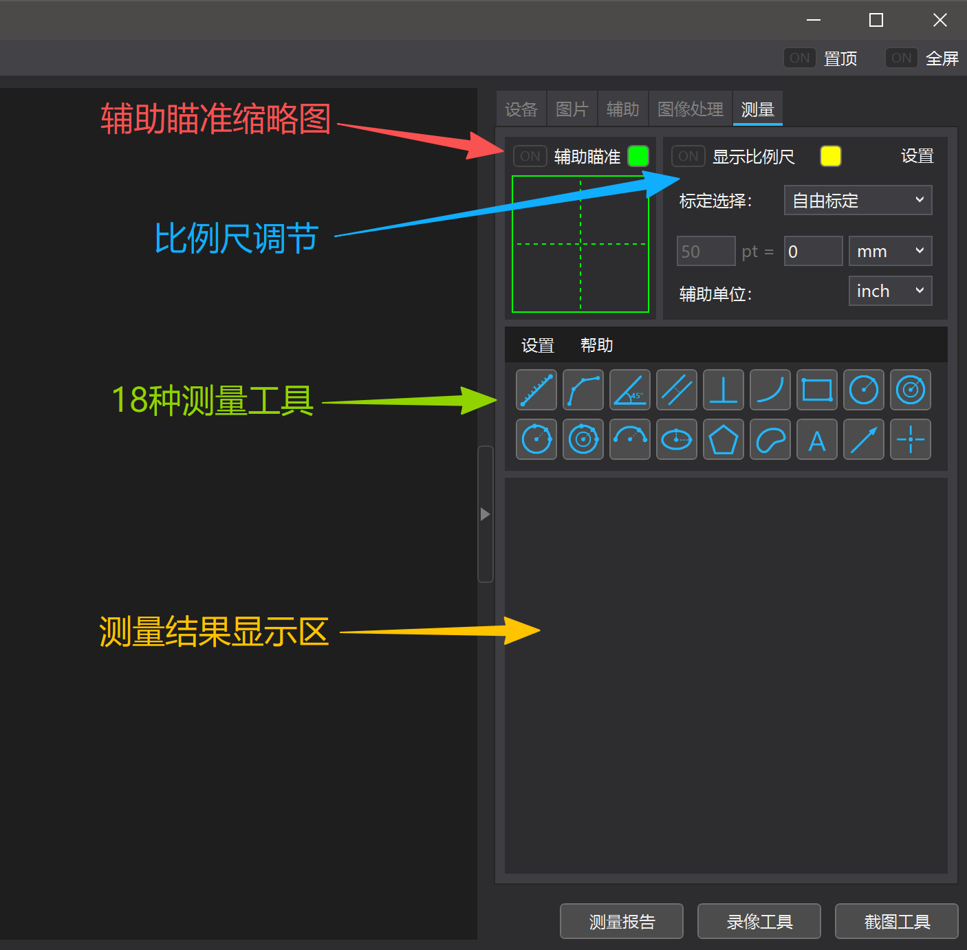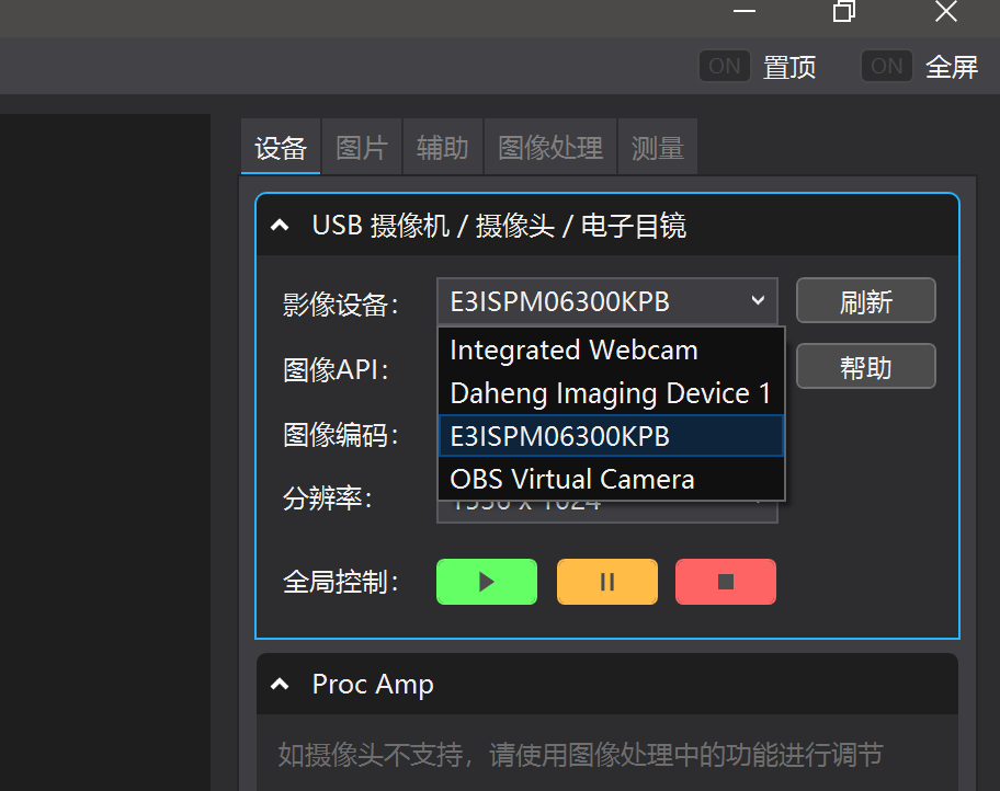 而右边就是一些常用功能,包括摄像头的启动停止、色彩设置、DirectShow设置、图片加载、辅助线、图像处理、测量工具等。如下图: