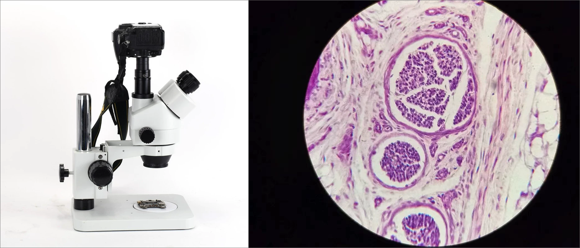 **方法一:**用转接环接微单相机,然后装到显微镜的第三目上,这样可以拍到不错的图像。但缺点也是比较明显的,一个相机的体积大,预览不方便,如果想在电脑上实时看,还需要装微单相机对应的专用软件。另一个缺点就是显微镜焦平面并没有针对APS-C或者全画幅来设计的,所以会看到相机的画面只有中间有图像,四周多半是黑的。效果如下图(图片来自淘宝):