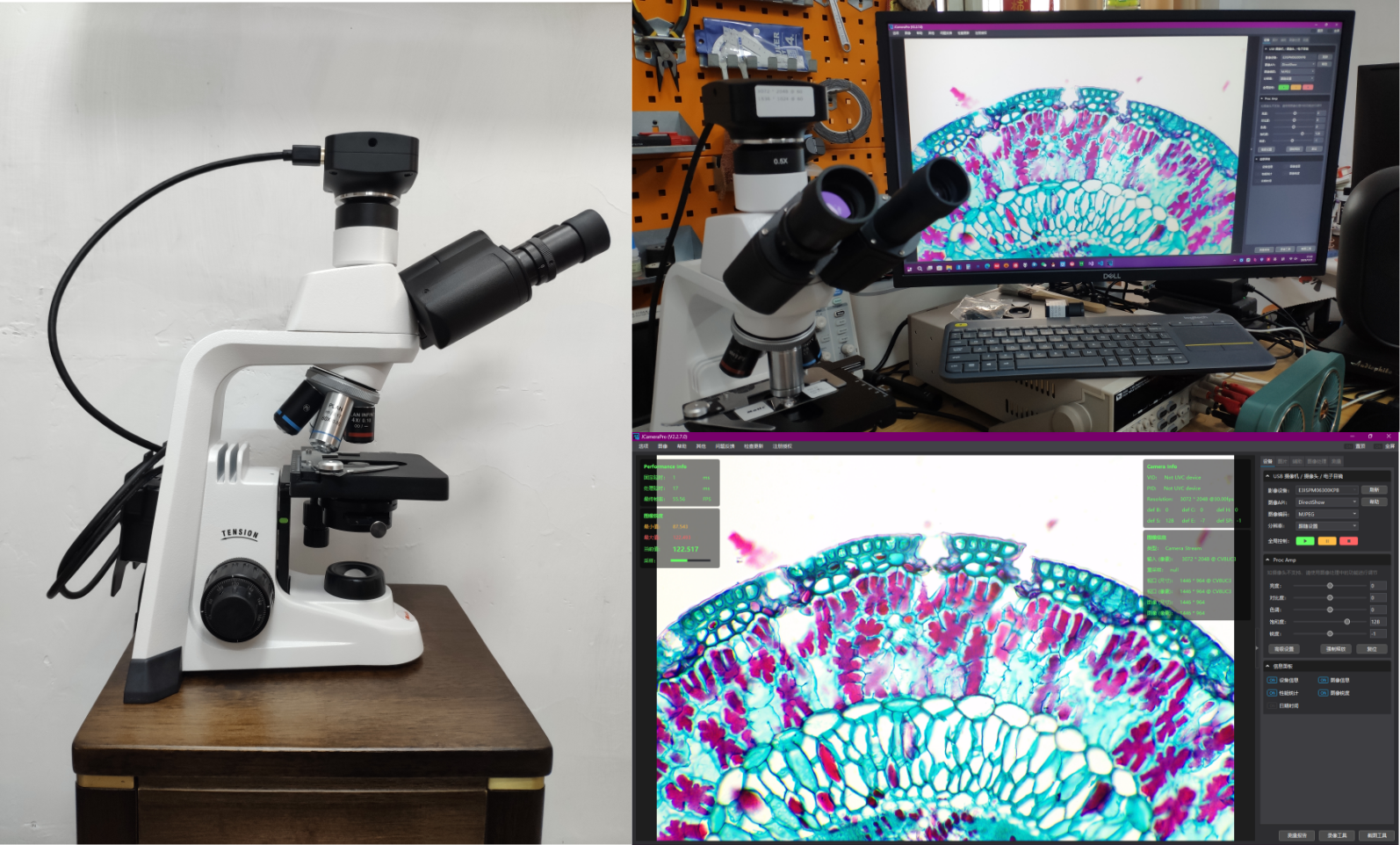 **方法三:**工业相机 + 图像采集软件,是比较完美的方案,虽然画质不是最好(相对于相机),但是真的很方便,同时也不影响肉眼观察目镜。现在很多工业相机都采用SONY Exmor传感器了,画质非常的好,已经不是旧时代那种傻瓜摄像头了。非常有代表性的传感器,IMX334和IMX178,其中IMX334是为数码相机和工业应用设计的,IMX178是专为高质量图像、视频捕捉、医疗成像设计的。唯一缺点就是,大部分高端产品,需要单独安装DirectShow驱动,否则很多通用软件都无法识别它们,文章后面会提及到。