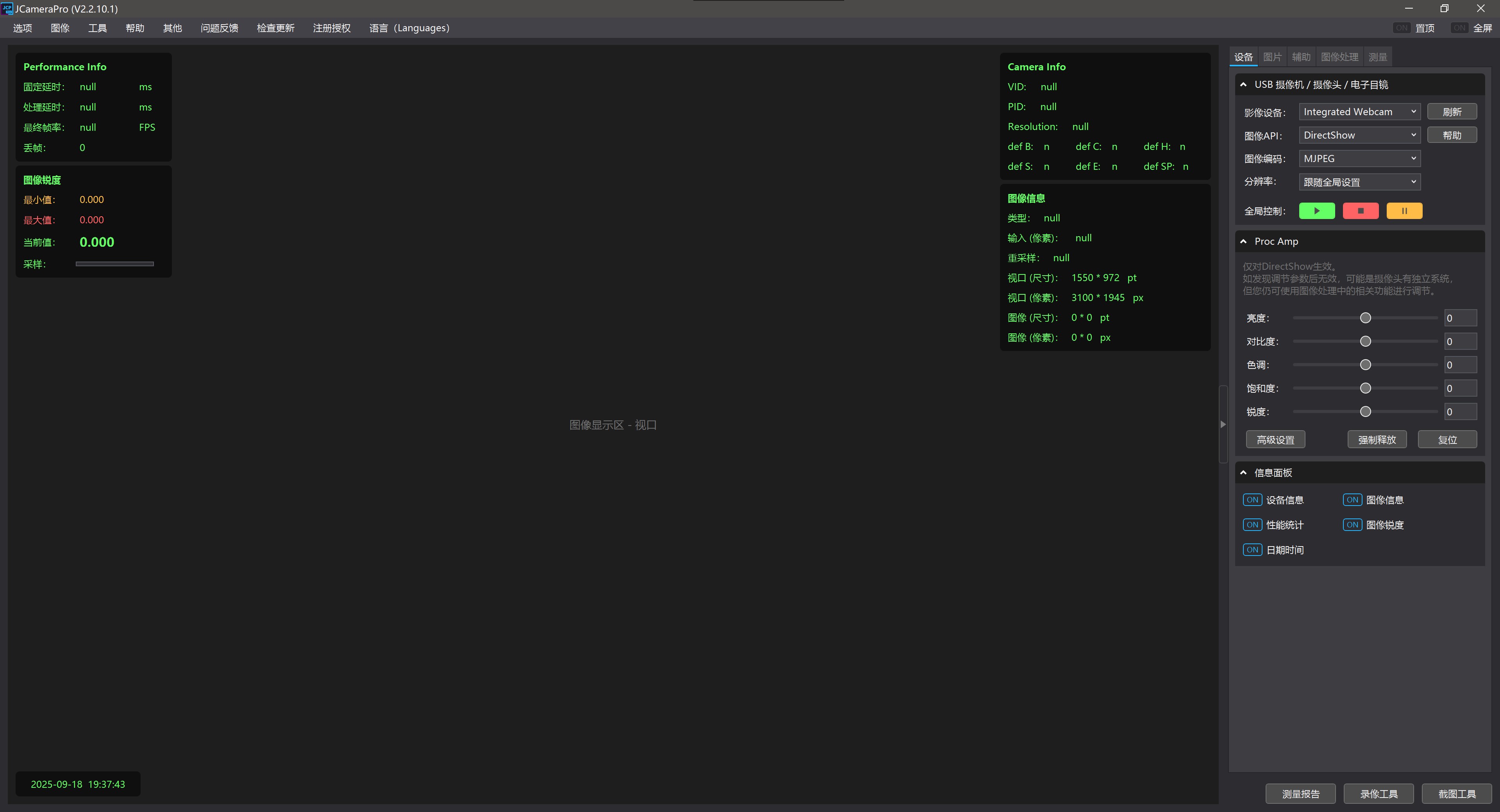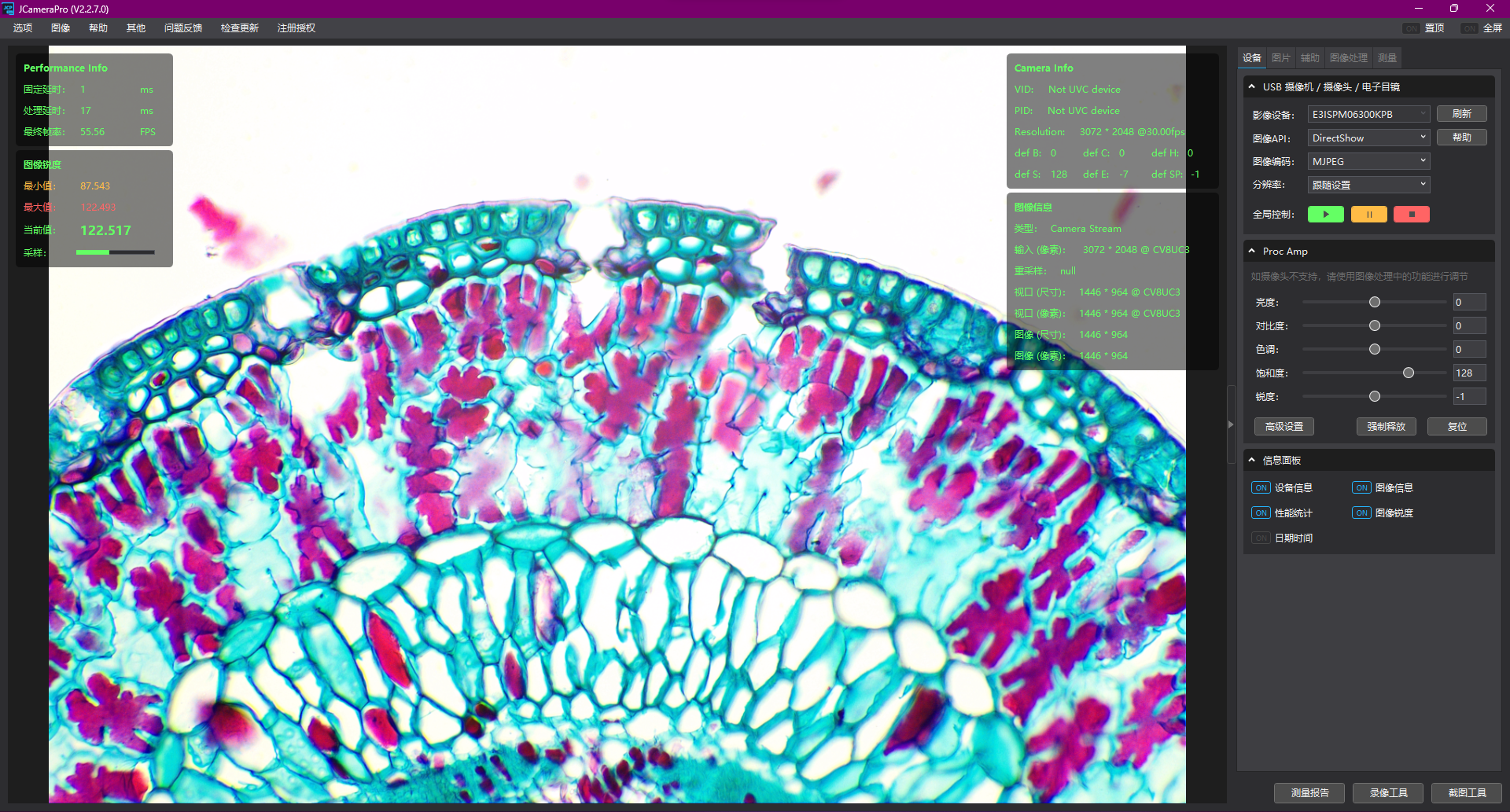 我这次选JCameraPro进行讲解,因为界面比较现代,而且操作简单,画面十分流畅,功能足够个人做显微图像采集和测量了。另外,它的界面都是矢量方式绘制的,在4K/2K显示器下都不会模糊和错乱,画面非常清晰。