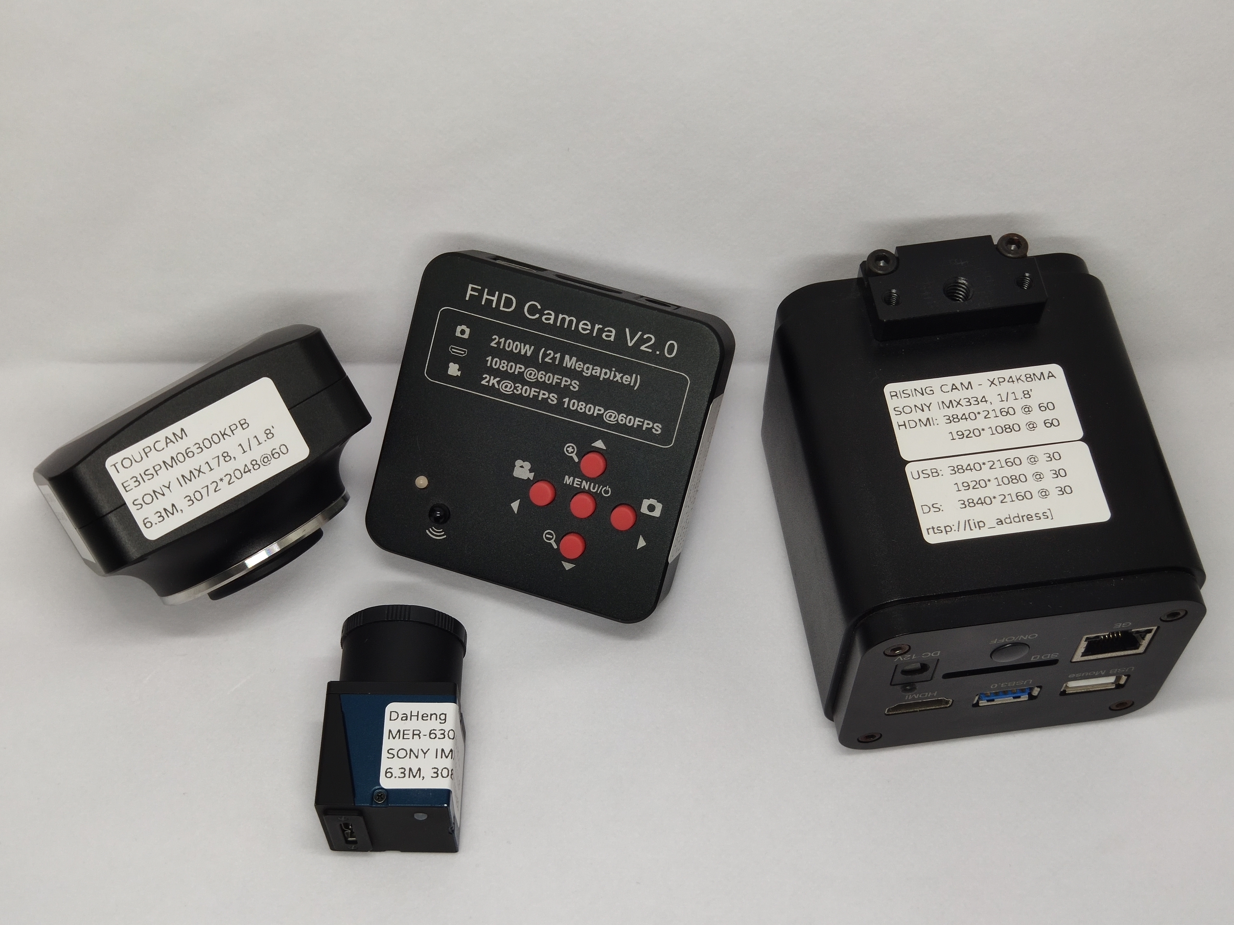 从左到右分别是 TOUPCAM(图谱)的E3ISPM06300KPB、奥微思高清摄像头(USB输出是1080p的,据商家介绍是个松下的传感器)、RisingCam(瑞神)的XCAM4K8MPA(自带LINUX系统,可以独立工作)。
