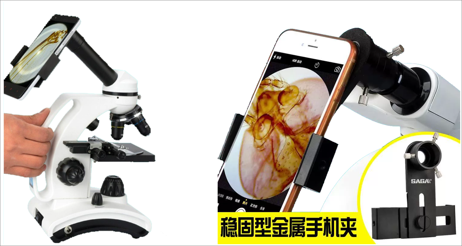 **方法二:**有一些文章介绍,是在目镜的镜筒处夹个手机支架进行拍摄,俗称"目镜后拍摄"(玩天文摄影的估计对这个名词也不陌生),肉眼观察到的图像,几乎就是手机拍到的图像。但缺点也很明显,除了跟相机一样只有中间部分有一圈图像外,还有一个缺点就是很难对准光轴,而且也不能直接在电脑上观察,只能拍完之后,用数据线传到电脑上,无法实时采集,同样是十分不方便的。如下图(图片来自淘宝):