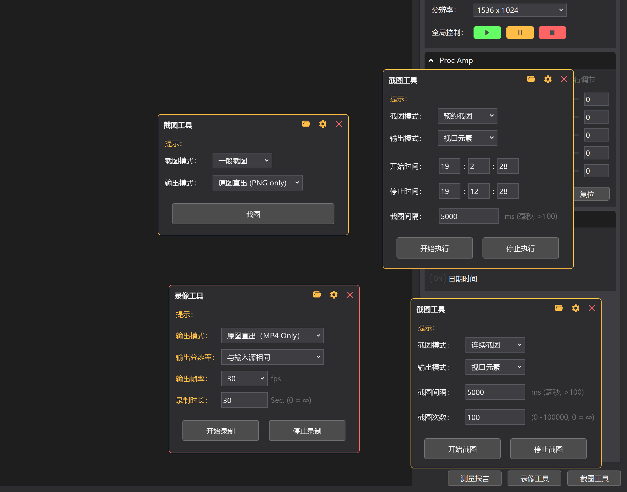 接着,最常用的可能就是截图工具和录像工具了,很神奇的是这两个工具都是多实例方式的,用户可以同时打开多个实例窗口一起使用,例如用户可以一边进行自动连续截图,一边可以手动截图,互不干扰。如下图: