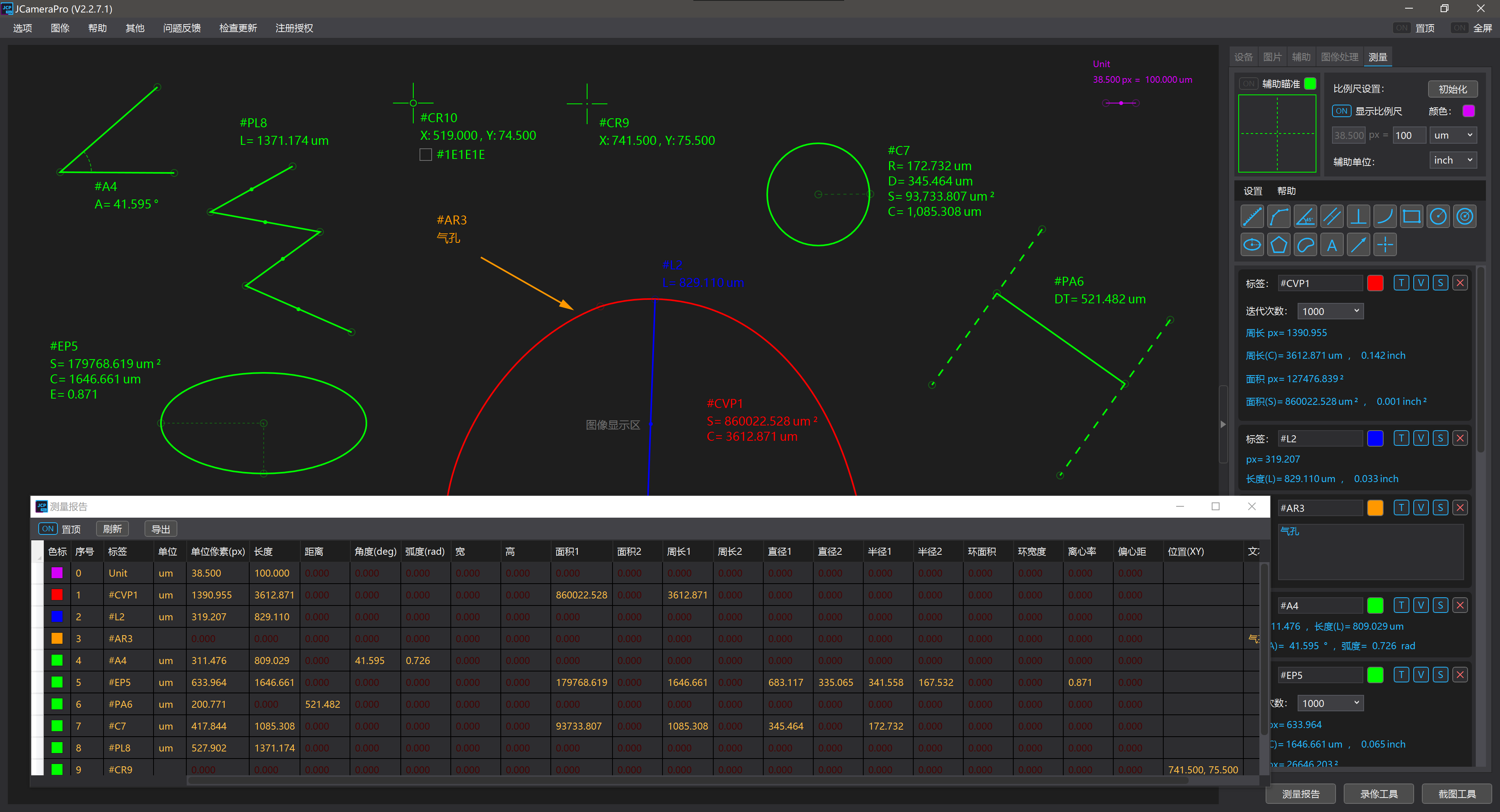 步骤3:放标本上去,开始用各种测量工具测量,数值都是自动计算的,非常方便,看下图,我随便拉了几个测量工具: