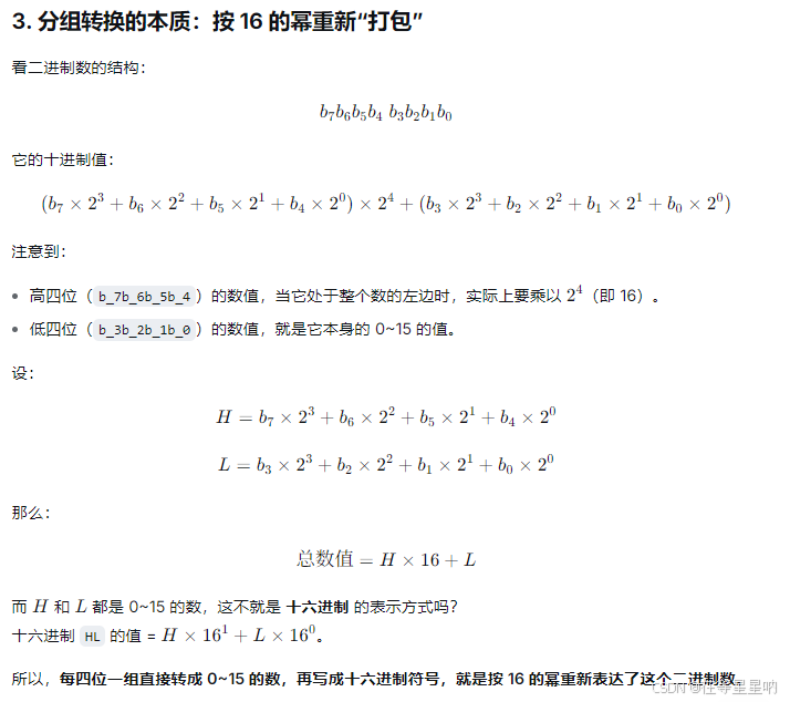 #因为2的四次方等于16,所以将二进制从右向左每四位分成一组,如果二进制数的位数不是4的倍数,则在最左边补0,使其变为4的倍数