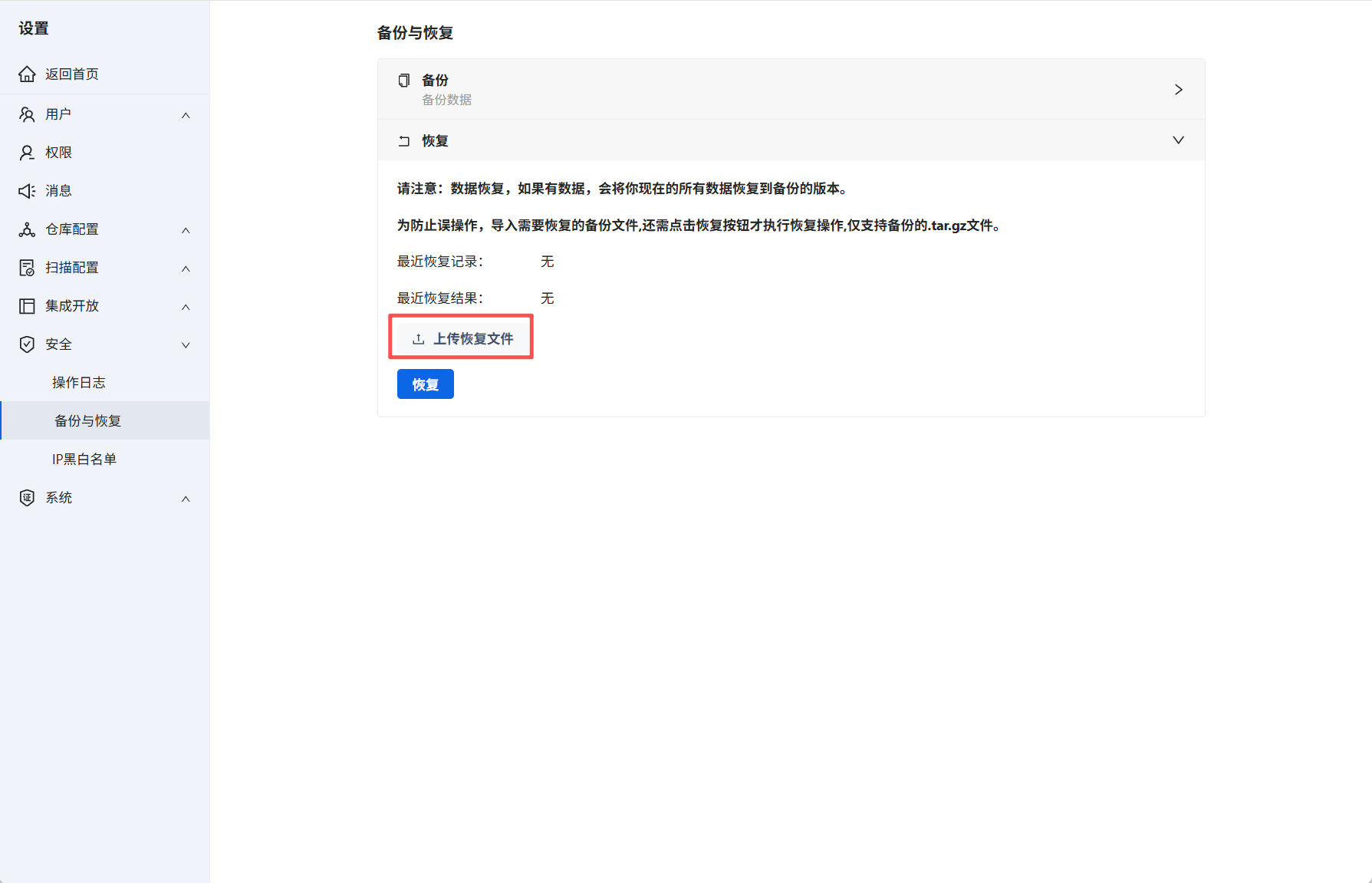 注意:恢复数据会将当前数据恢复到上传备份包的数据,请谨慎操作!
