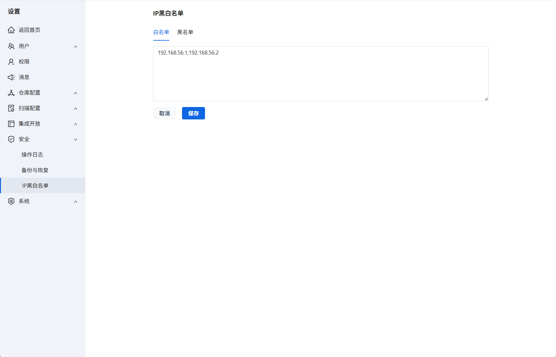 可设置多个IP白名单,使用英文逗号隔开。添加完成后,在设置列表显示响应的名单。