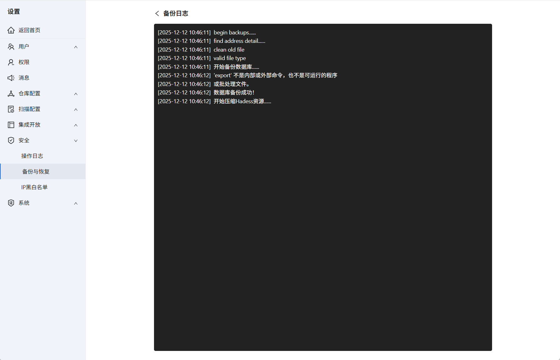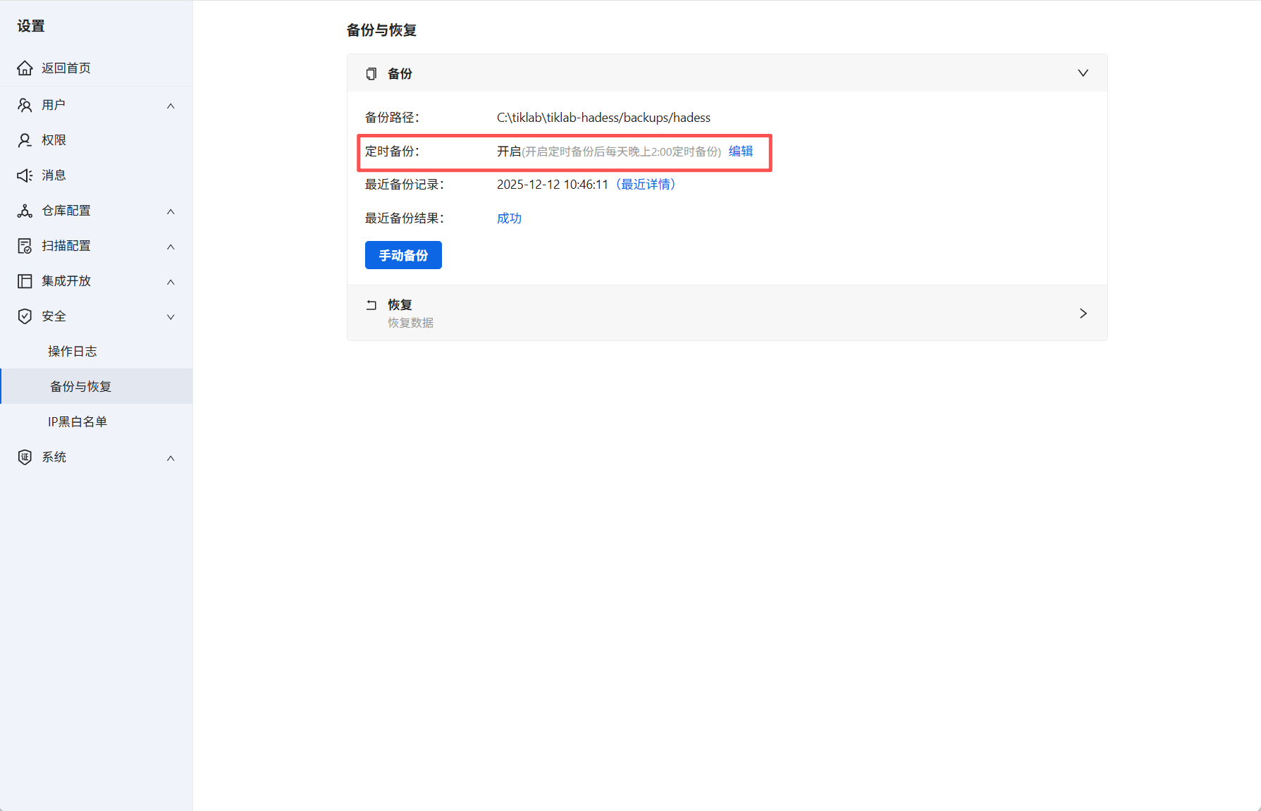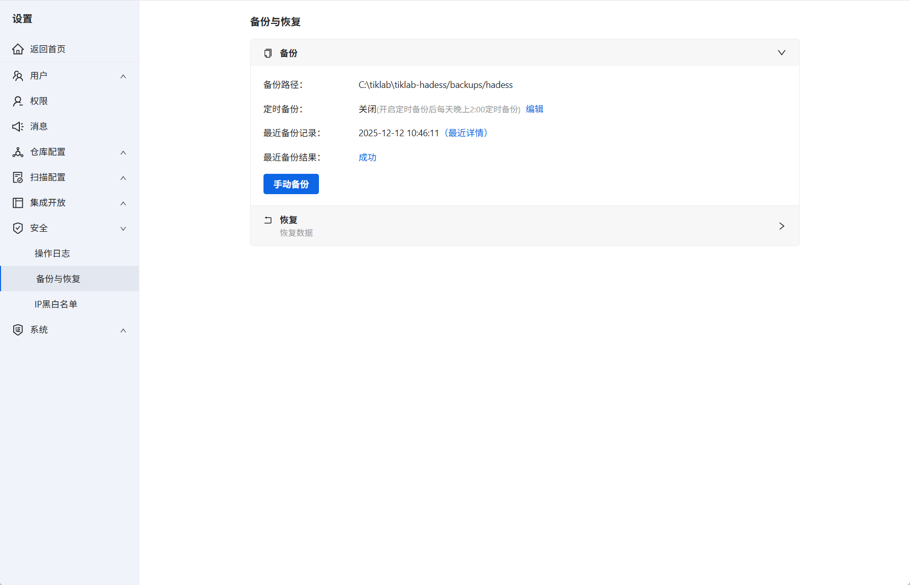 进入Hadess系统设置→安全→备份与恢复,找到备份选项。数据备份支持手动备份或者自动备份。