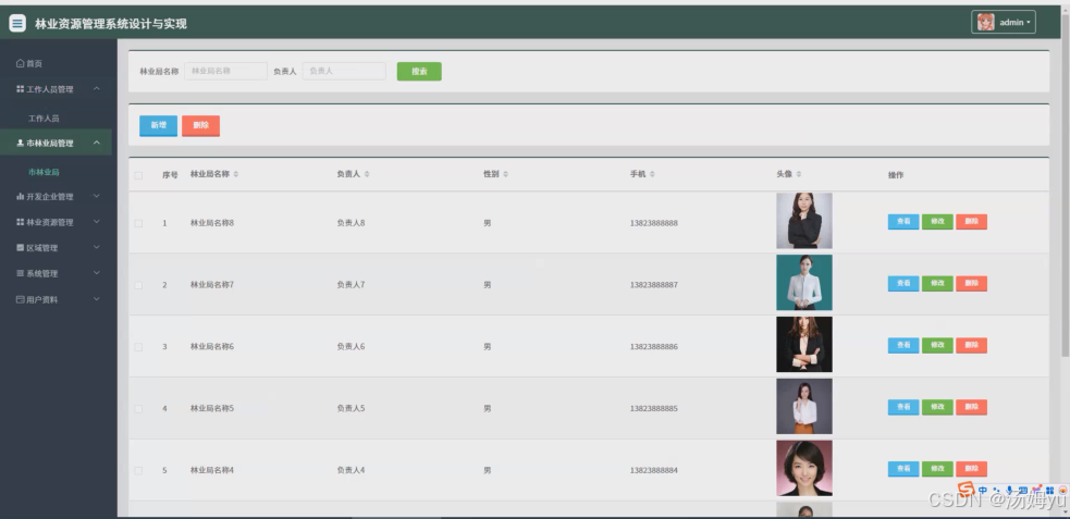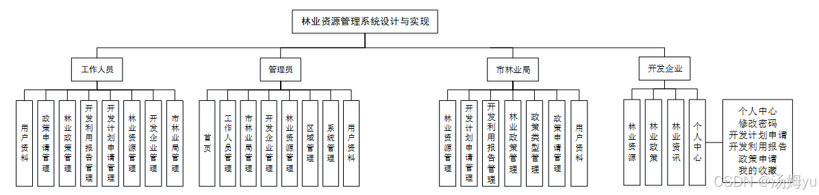 工作人员管理模块旨在对林业工作人员的职责、任务分配和工作记录进行跟踪和管理,确保林业工作的有序进行。市林业局管理模块则为市级林业管理机构提供一个平台,用于监控和指导下属单位的工作,制定政策和规划。开发企业管理模块专注于对参与林业资源开发的企业进行监管,确保其活动符合法律法规,保护森林资源不受破坏。