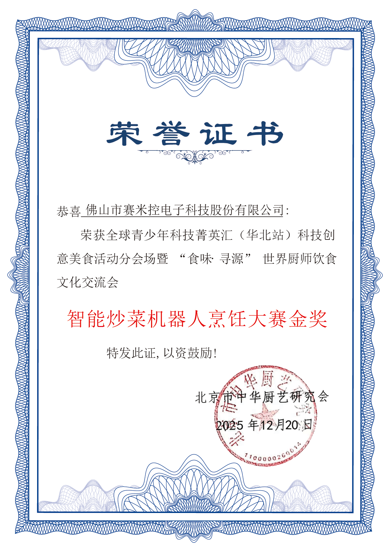 2025年12月20日,在全球青少年科技菁英汇(华北站)暨"食味·寻源"世界厨艺饮食文化交流会活动现场,赛米控电子科技股份有限公司参赛的炒菜机器人作品《节节高升少年志》、《吉红满堂有余宴》,凭借创新科技与营养理念的深度融合,成功斩获"智能炒菜机器人烹饪大赛金奖"。这一荣誉的获得,标志着智能烹饪技术在青少年健康饮食领域的应用价值已获得行业权威认可。