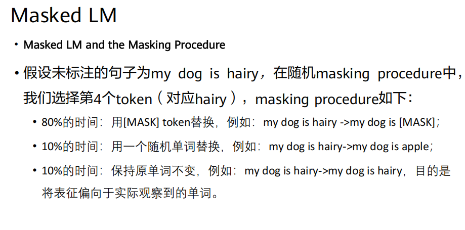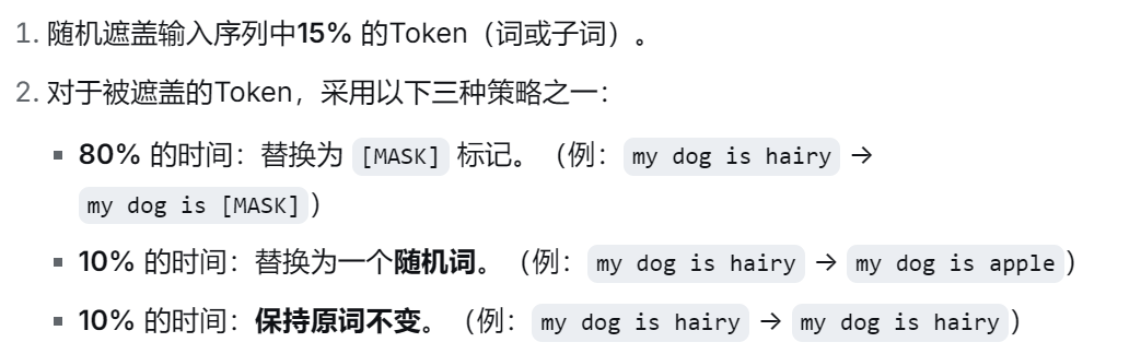 训练目标 :让模型根据未被遮盖的上下文词语(双向的),来预测被遮盖位置上的原始词。