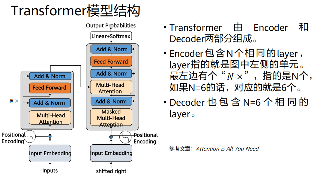 Decoder :N x [掩码多头自注意力层 + 多头注意力层(连接Encoder) + 前馈网络层] (Add & Norm环绕)。