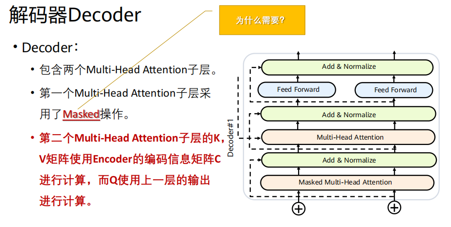 多头注意力层(Multi-Head Attention) :这里的Key和Value来自编码器的最终输出,Query来自上一层输出。这是连接编码器和解码器的关键。