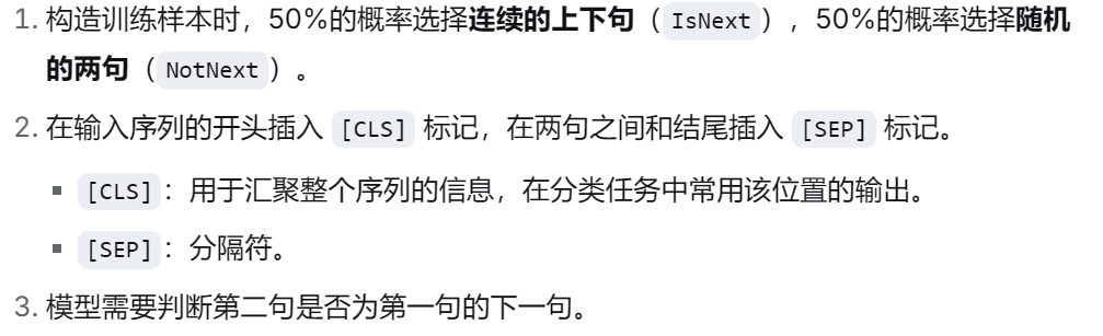意义 :让模型学习句子级别的语义关系,这对问答(QA)、自然语言推理(NLI)等需要理解句子间关系的任务至关重要。