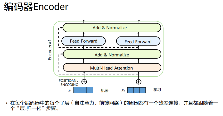 一个编码器层 = (多头自注意力 + Add & Norm) + (前馈网络 + Add & Norm)。