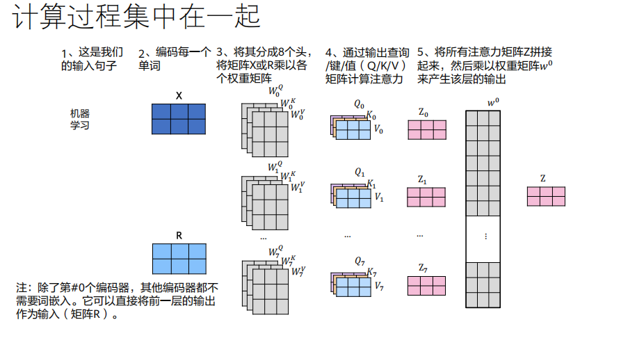 X被8组不同的权重矩阵投影,得到8组不同的(Q_i, K_i, V_i)。并行计算 :对每一组