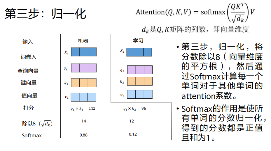 分数2 = q1 · k2("机器"与"学习"的相关性)结果:得到一组分数,分数越高表示相关性越强。